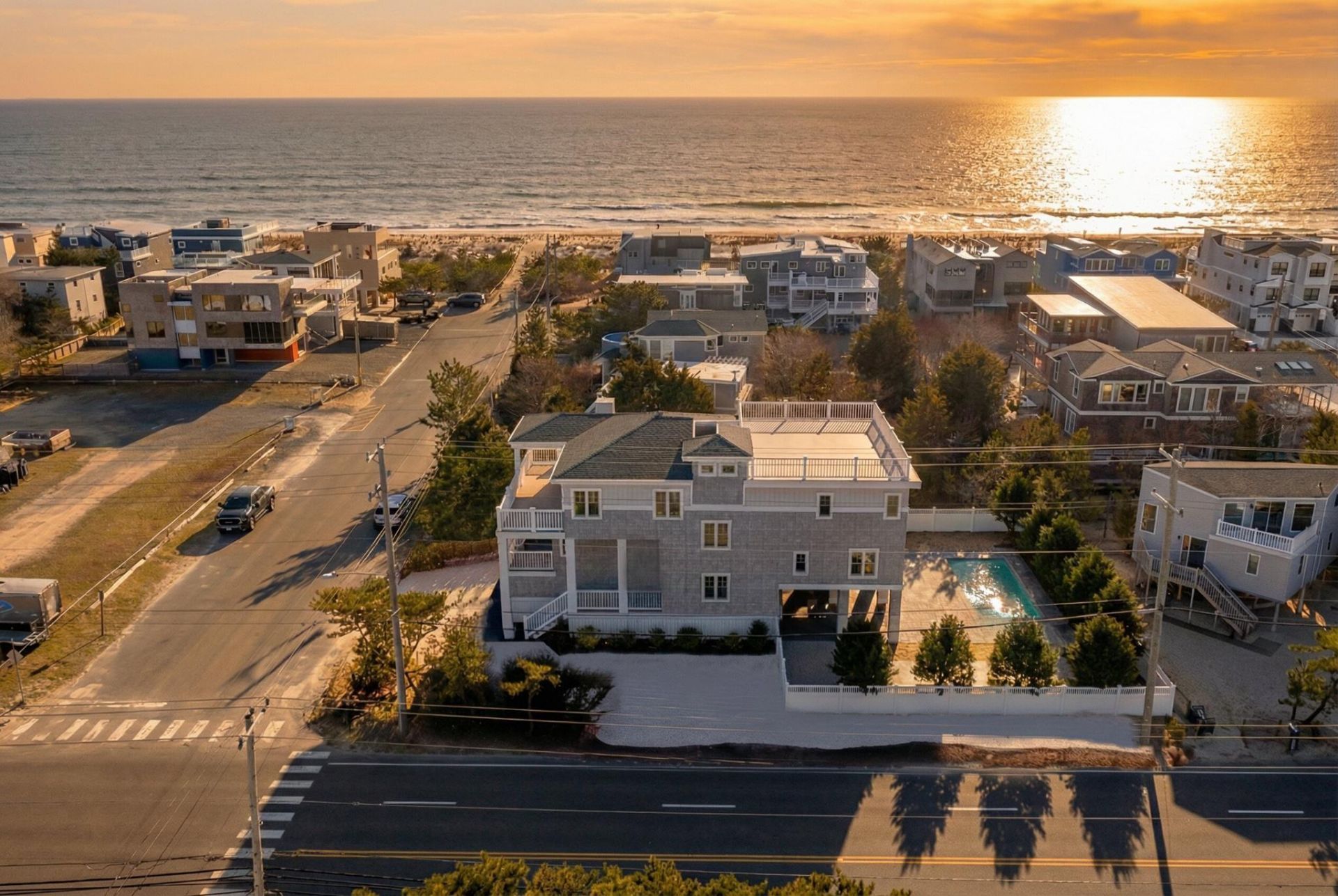 New construction being built by Johnson Darling Homes, one of Long Beach Island’s most trusted custom home builders. Expected completion fall 2026, giving you time to plan your first full season. This 3,126 square foot, 5 bedroom, 4.5 bath residence in Harvey Cedars features oak floors throughout. The kitchen is appointed with Wolf and Sub-Zero appliances. The bedroom and family room level includes a dedicated laundry room and wet bar. An elevator services all floors, making this home as practical as it is beautiful for guests and family of all ages. The 10 x 20 foot pool creates a backyard retreat that feels entirely your own. Rinse off at the outdoor shower before heading inside. The outdoor space also features an 800 plus square foot fiberglass rooftop deck to enjoy ocean and bay views. Directly across the street sits the historic Long Beach Island Fishing Club. That open lot is a permanent landmark, meaning your views and your breathing room are protected. Steps from Harvey Cedars Municipal Park, where summer comes alive with Wednesday evening concerts, pickleball courts, basketball, a playground, and a walking path. One of the island’s most prominent surf beaches is equally close. This is the home for the buyer who is ready to own something their family will return to every summer for generations.