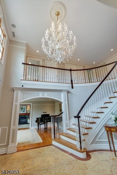 Resting on nearly half an acre of land, this gorgeous 3-Story Grand Entrance Hall Colonial home enjoys a beautiful and quiet setting in the highly sought after Hartshorn section of Short Hills. The stunning gourmet kitchen with a fabulous open design includes a generously-sized pantry, as well as a center island breakfast bar and casual breakfast area, in addition to the home's formal dining room. There is a relaxing family room with a cozy wood-burning fireplace, and French doors that open to a large deck and private backyard, providing ample space for al fresco dining. A formal living room, a library with a gas fireplace, a guest bedroom with an en suite, and a handy powder room complete the first floor. The master bedroom is spacious and luxurious, with a sitting room, large walk-in closet, and private bathroom including a steam shower and jetted tub. Four more bedrooms, including the primary suite, are comfortably nestled on the second floor, with an additional bedroom on the third floor and in the finished basement. Completing the home is a finished lower level with a wet bar, move room, rec room, bedroom, and full bath, which connects with an oversized two-car garage.